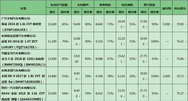 此次抽车评价结果,包括国内5家主流车企的5款热销车型:广汽丰田汽车有限公司,雷凌 2016款1.6L CVT 精英型(已停售);东风悦达起亚汽车有限公司,起亚K5 2016款 1.6T DCT LUXURY;华晨宝马汽车有限公司,宝马3系 2018款 320Li时尚型;东风本田汽车有限公司,本田XR-V 2017款 1.8L CVT 舒适型 Exi;四川一汽丰田汽车有限公司,RAV4荣放2018款 2.0L CVT 风尚型 两驱。